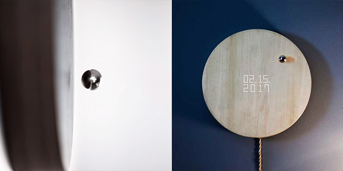 “Story”外型十分簡約,只有一塊高 42.5 毫米、直徑 268 毫米的胡桃木或白蠟?zāi)局瞥傻膱A形鐘面,以及一粒直徑 16 毫米的懸浮金屬球體。沒有任何時間刻度,也沒有指針,但懸浮的金屬球體會以運轉(zhuǎn)的形式來標(biāo)記時間的軌跡,令人不禁聯(lián)想到宇宙中圍繞太陽公轉(zhuǎn)的星球。