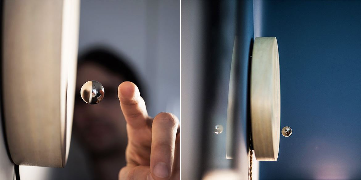 “Story”外型十分簡約,只有一塊高 42.5 毫米、直徑 268 毫米的胡桃木或白蠟?zāi)局瞥傻膱A形鐘面,以及一粒直徑 16 毫米的懸浮金屬球體。沒有任何時間刻度,也沒有指針,但懸浮的金屬球體會以運轉(zhuǎn)的形式來標(biāo)記時間的軌跡,令人不禁聯(lián)想到宇宙中圍繞太陽公轉(zhuǎn)的星球。